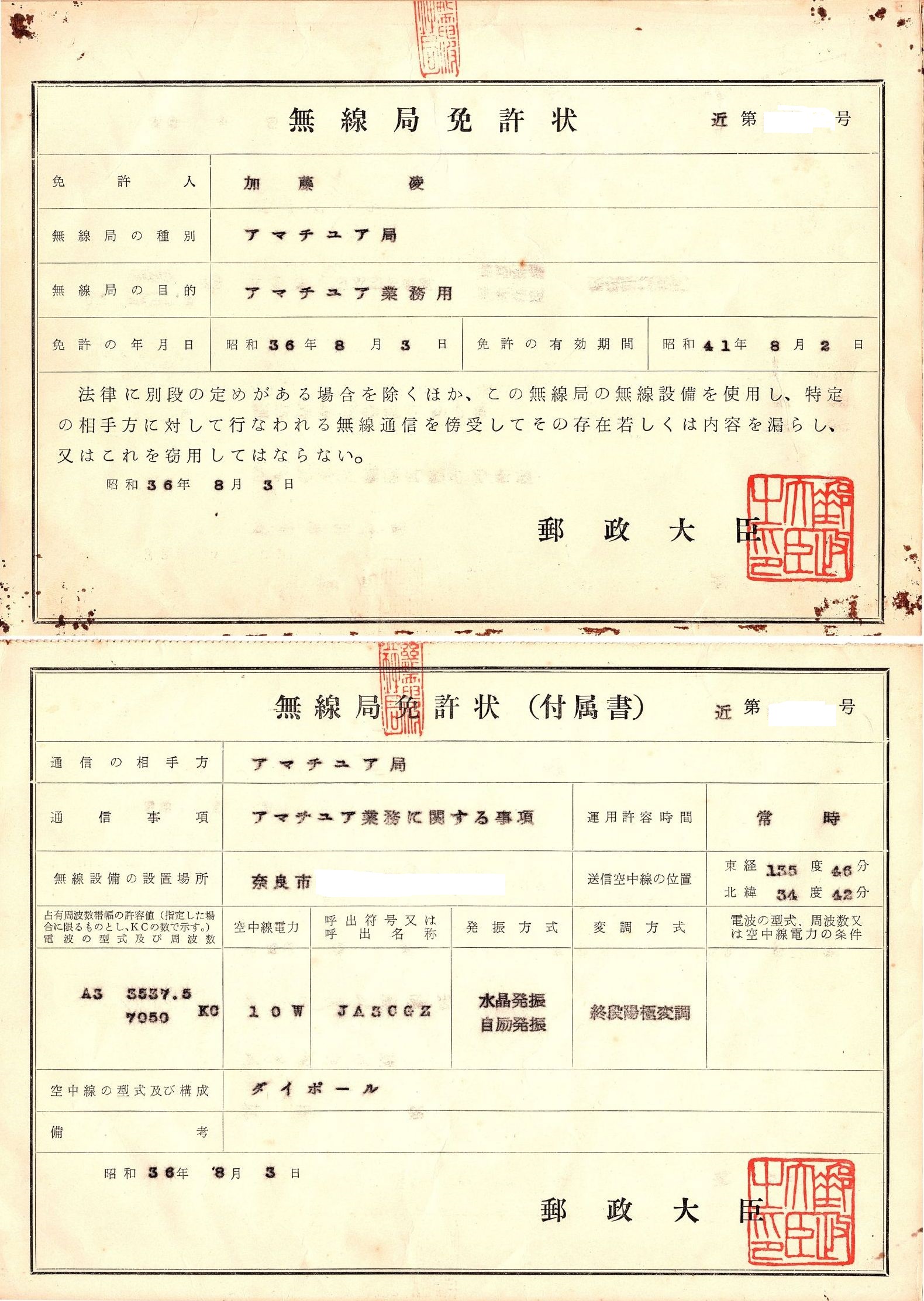 • 1962年3月9日:無線局指定事項の変更許可(A1、A3モード / 10W / 14・21・28・50MHzの運用が許可)