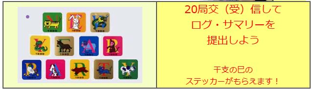 QSOパーティで20局以上の交信(SWLは20局受信)をした場合は、JARL制定のサマリーシートとログシートを使用して、1月31日までにJARL会員課に提出すれば、今年は、干支の「巳」のステッカーがもらえます。
