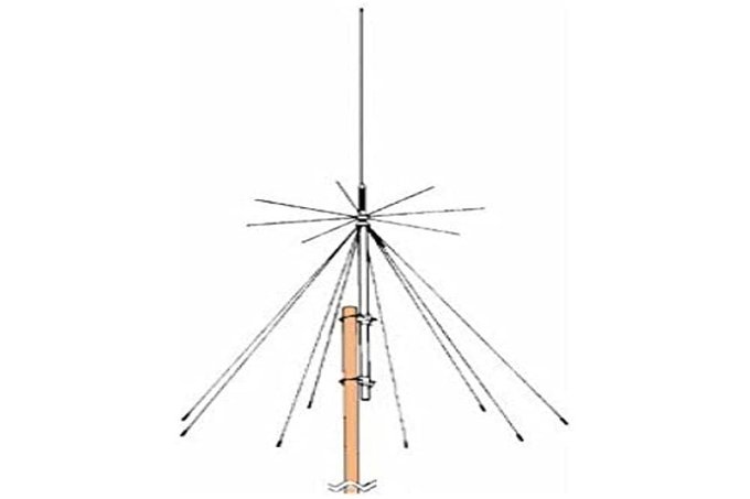 ディスコーンアンテナ ディスク(円盤)とコーン(円錐)を組み合わせた傘の骨のようなアンテナ。VHFからUHFの広帯域受信用として使用される。無指向性なので利得は高くない。市販品では上部に送信用のホイップアンテナを付けた製品が多い。 |