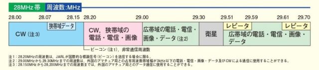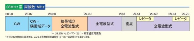 また、29.00-29.30MHzおよび29.51-29.7MHz「広帯域の電話・電信・画像・データ」区分から「全電波型式」区分に(29.51-29.59MHzおよび29.61-29.70MHzはレピータへの使用が可能)なります。