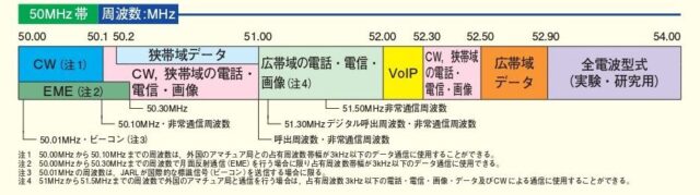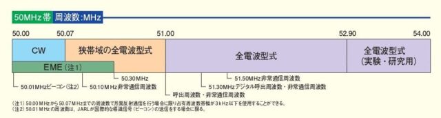 また、50.07-51.00MHzを「狭帯域の全電波型式」区分に、51.00-52.90MHzを全電波型式」区分に、52.90-54.00MHzは「全電波型式(実験・研究用)」区分となります。