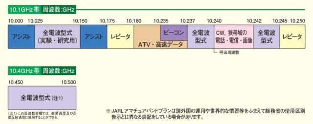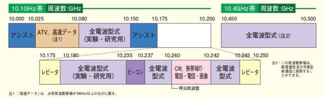 『現在の運用状況等を考慮して10.025-10.150GHzを「全電波型式(実験・研究用)」として、10.180-10.237GHzを「ATV・高速データ(ビーコン可)」区分と改正することにします。(告示では、いずれの区分も「すべての電波型式」区分となります。)
