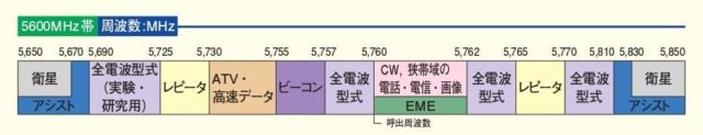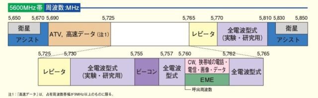 『現在の運用状況等を考慮して5690-5725MHzを「全電波型式(実験・研究用)として、5730-5755MHzを「ATV・高速データ」区分へ改正することとし、1200MHz帯および2400MHz帯と同様に、「CW、狭帯域の電話・電信・画像」区分および「ビーコン」区分についても、告示では「すべての電波型式」区分となりますが、EMEや狭帯域通信を保護するため、JARLバンドプランでは表記を継続することにします。』