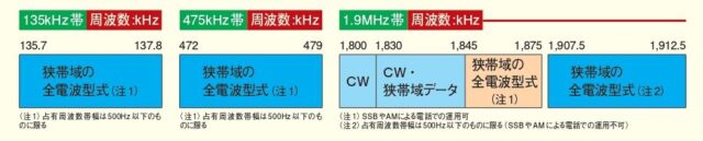 また、1907.5-1912.5kHzについては、これまで「CW、狭帯域データ」区分でしたが、「狭帯域のすべての電波型式(注1)」として、OBWが500Hz以下のすべての電波型式での運用が可能になります。(画像通信などは可能ですが、 SSBやAMの音声通信はこれまで同様に実質不可です。)』