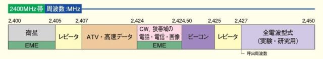 『告示では2407-2425MHzまでが「すべての電波型式」区分に改正されますが、現在の利用状況等を考慮して、「ATV・高速データ」、「CW、狭帯域の電話・電信・画像(EME可)」、「ビーコン」の各区分をバンドプランでは継続することにします。』