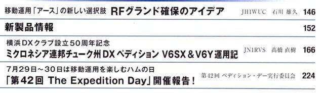紹介した他にも「CW運用ステップアップ(120p)」「入門ハムの英会話(138p)」が連載中です。「QSL INFORMATION(194p)」、「国内・海外コンテストカレンダー(214p/216p)やコンテスト規約(218p)」も、毎日の運用には欠かせません。