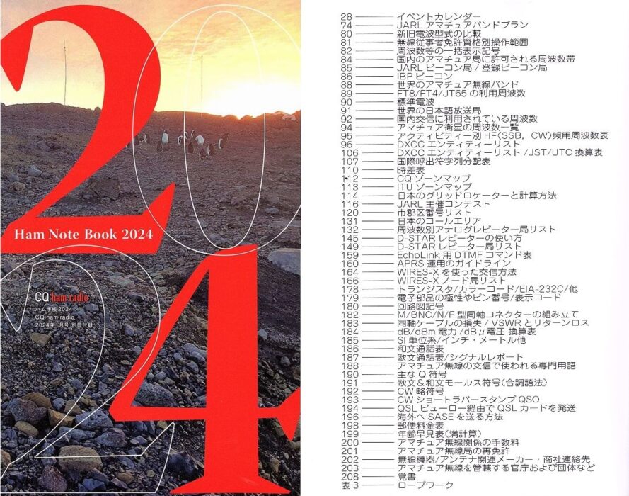 CQ ham radio 2024年1月号別冊付録「ハム手帳2024」表紙(左)と目次(右)