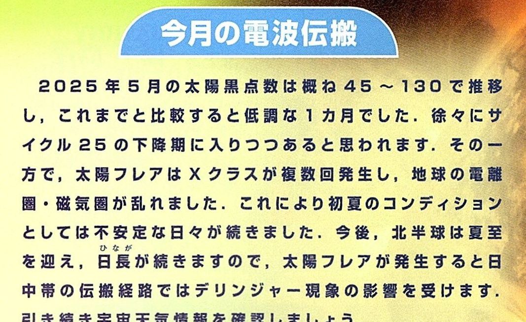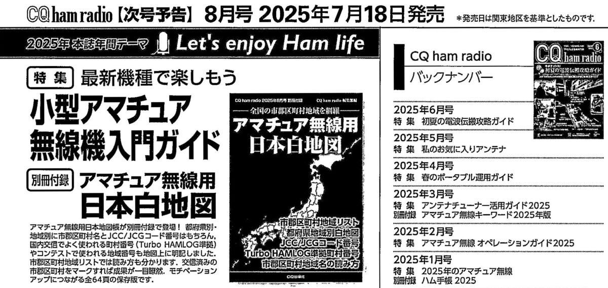 「CQ ham radio 2025年7月号」が本日6月18日(水)に届きました。年間予約購入をしているので、お店よりも2~3日早く手に入ります。今月はチッョト遅い!?(最近は、宅配事情もあってか、到着が以前よりも遅めになっています)