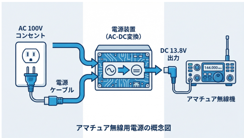 アマチュア無線で使われる多くの無線機は、自動車のバッテリーと同じ「直流13.8V」で動作するように設計されています。しかし、家庭用のコンセントから供給されるのは「交流100V」です。そのため、この交流100Vを直流13.8Vに変換し、かつ電圧を常に一定に保つための装置、それが直流安定化電源です。