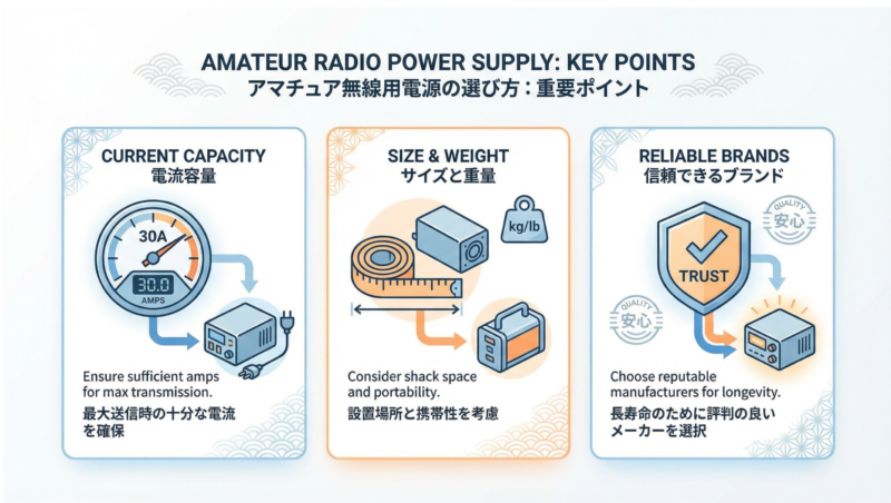 近年では、技術の進歩によりスイッチング電源のノイズ対策も進化しており、小型・軽量であることから主流となっています。一方で、ノイズを徹底的に嫌うHF帯のDX通信などを主に行う方には、今でも根強くトランス式が支持されています。それぞれの特徴を理解し、ご自身のシャック(無線室)環境や運用スタイルに合わせて選ぶことが重要です。