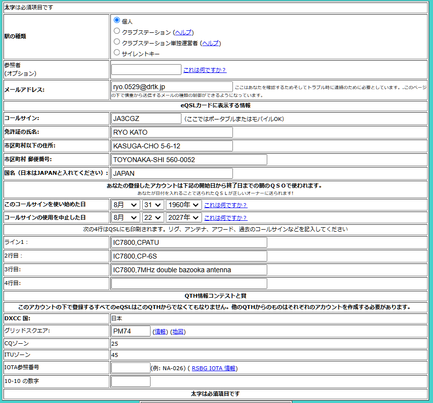 • リグ、アンテナ、アワード、過去のコールサインなど ➡ 必要に応じて入力