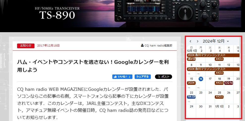 ”CQ ham radio WEB MAGAZINE”にGoogleカレンダーが設置された