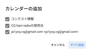 Googleアカウントにログインしている状態で,カレンダーの下に表示されている[+Googleカレンダー]をクリックします.すると,カレンダーの追加のウィンドウが開きます(図3).追加したいカテゴリにチェックを入れて[すべて追加]をクリックすると,CQ ham radioカレンダーの情報が自分のカレンダーの情報と合わせて表示されるようになります.