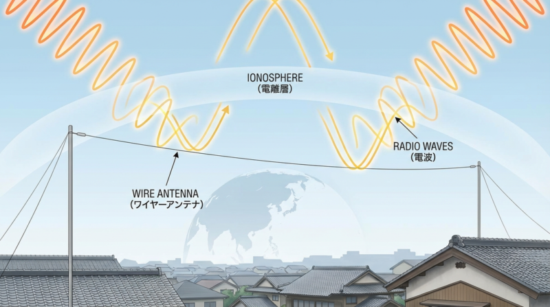 地上高やアンテナの張り方にもよりますが、適切に設置されたワイヤーアンテナは、電波を低い角度で効率よく放射する特性があります。この低い打ち上げ角の電波が、上空にある電離層で反射し、遠く海外まで到達するのです。まさに、DX通信にうってつけの特性と言えるでしょう。