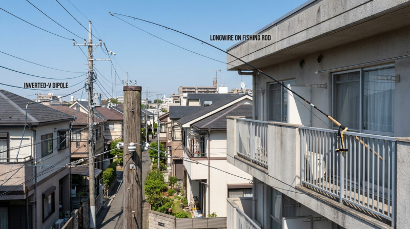 ロングワイヤーアンテナ、特にアパマンハムにおすすめなのが、グラスファイバー製の釣り竿をマスト代わりにする方法です。ベランダから釣り竿を斜めに突き出し、その先端からアンテナ線を垂らすことで、手軽に高さを稼ぐことができます。詳細はこちらの記事でも解説していますので、ぜひ参考にしてください 。