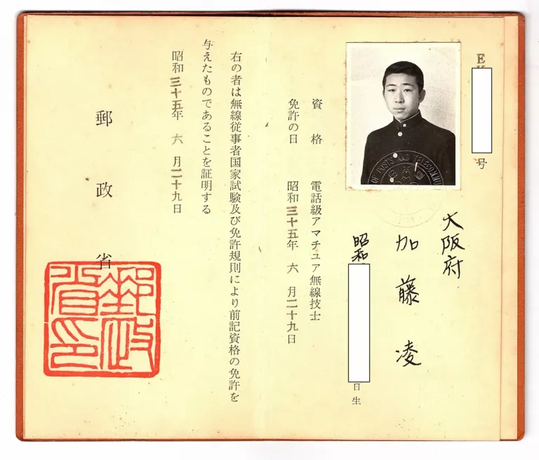 中2の春休み、あやめ池遊園地でのハム公開交信をきっかけに無線機の魅力に触れ、電話級(現4級)資格を取得。高1の夏、予備免許交付(申請から40日後)を受け試験電波発射を開始し、近隣のインターフェア調査を経て落成検査に臨む。