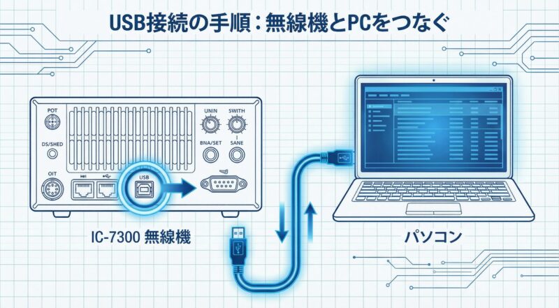 ここからは、いよいよ実践的な設定手順に入ります。まずは、IC-7300とPCを物理的に接続し、PCが無線機を認識できるようにします。