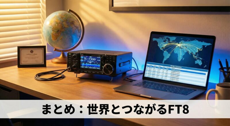 IC-7300を使ったFT8の始め方、いかがでしたでしょうか。 最初は少し複雑に感じますが、一つ一つのステップを丁寧に進めれば、必ず設定は完了します。 USBケーブル1本で始められる手軽さは、IC-7300の大きな魅力です。