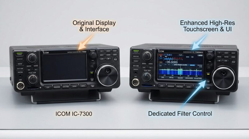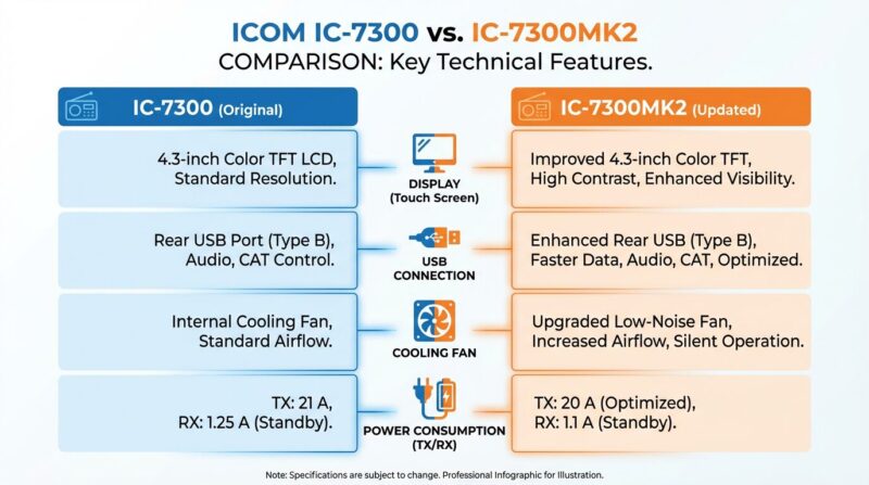 進化点を一目でご理解いただくために、IC-7300とIC-7300MK2の主な違いを比較表にまとめました。買い替えを検討する際の参考にしてください。
