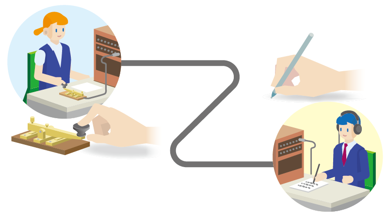 モールスと彼のチームは、電気の信号を受信して紙テープに印を付けるモールス電信機を作りました。電気信号は電話線を利用して届けていました。