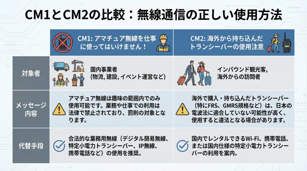 さらに注目すべきは、同時に公開された2本目のCM「海外から持ち込んだトランシーバーの使用注意」です。こちらは英語のタイトルとナレーションで、「海外から持ち込んだトランシーバーの使用は、日本の電波法に違反する可能性があります」と、増加するインバウンド観光客に向けて注意を促しています。