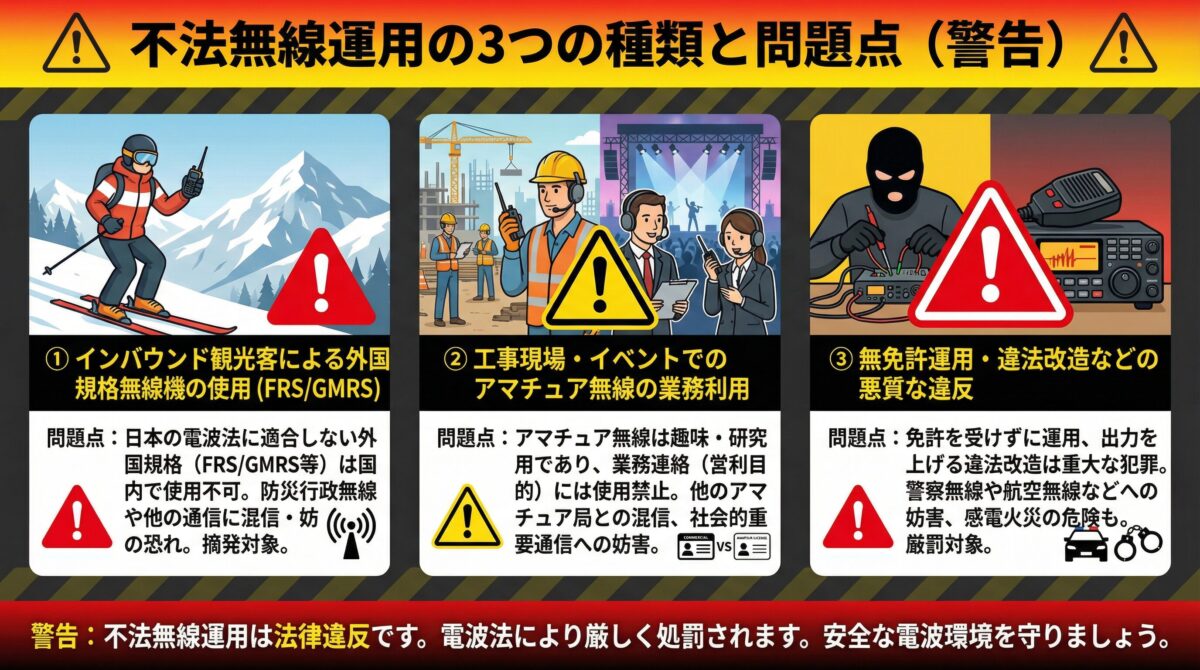 今回のCM公開の背景には、アマチュア無線の不法運用が後を絶たず、その手口が多様化・深刻化している現状があります。特に問題となっているのが、以下の3つのケースです。