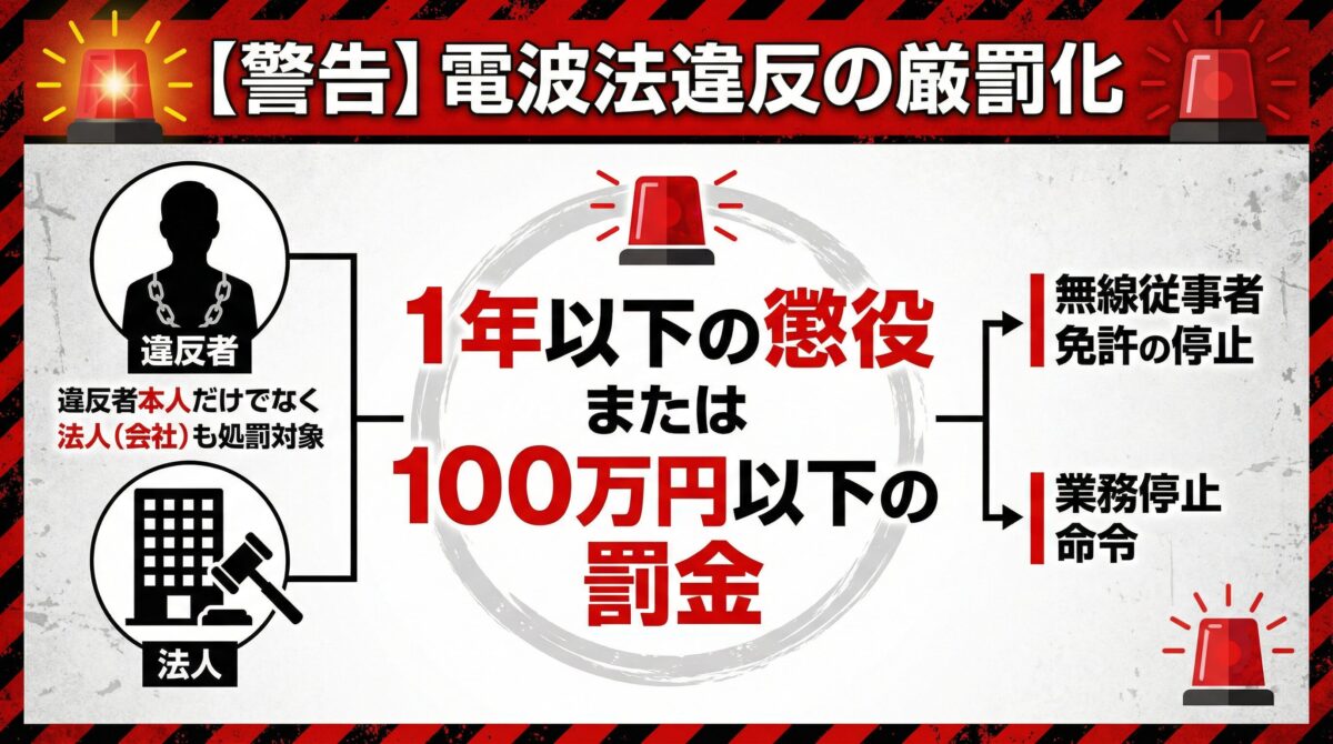 コスト削減や手軽さから行われるこれらの行為は、明確な電波法違反であり、厳しい取り締まりの対象となっています。