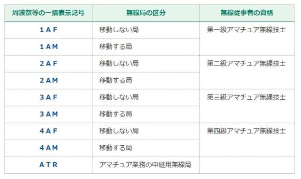 申請書の記載や免許状表記の簡素合理化のため、 無線局免許状などの 「電波の型式、周波数及び空中 線電力」の欄は、例えば 「4AM」 (4アマの移動する局)、 「1AF」 (1アマの移動しない局) といったように周波数等 の一括表示記号で記載されるようになりました。