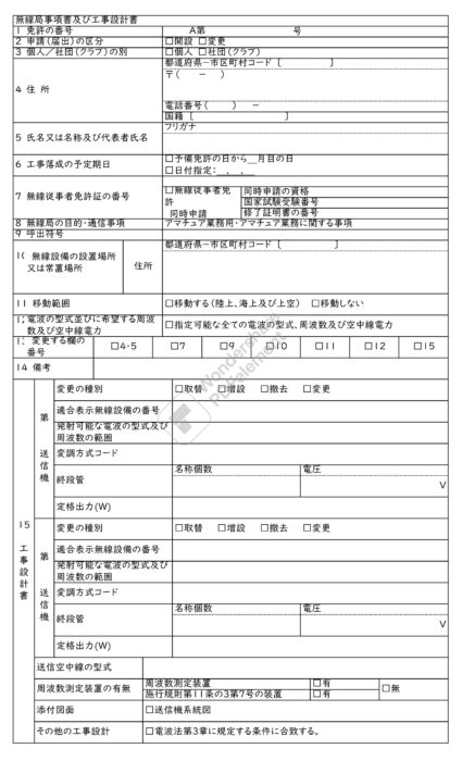 これから50Wを超えるような「移動しない局」を開設したり、現時点で免許を受けている 「移動しない」局の無線設備の変更を行う場合は、この書類が必須となります。
